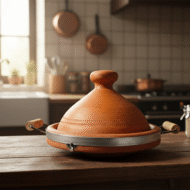 Handcrafted in Morocco from natural ceramic clay, this traditional tagine brings centuries-old North African cooking techniques into your modern kitchen. The 30 cm base is paired with a distinctive conical lid featuring hand-carved geometric motifs and sturdy wooden side handles—combining beauty, authenticity, and everyday functionality.