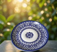 A striking duo of hand-painted Moroccan ceramic plates featuring deep cobalt blue geometric patterns on a pure white base. Crafted in Fez using centuries-old pottery techniques, these 13.7″ platters bring bold artistry and exceptional craftsmanship to your table—perfect for serving, decorating, or elevating food photography.