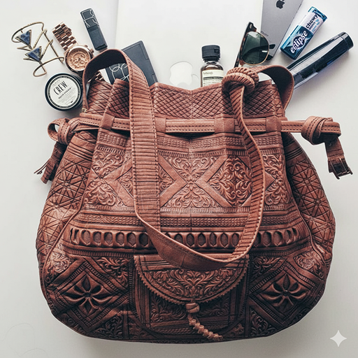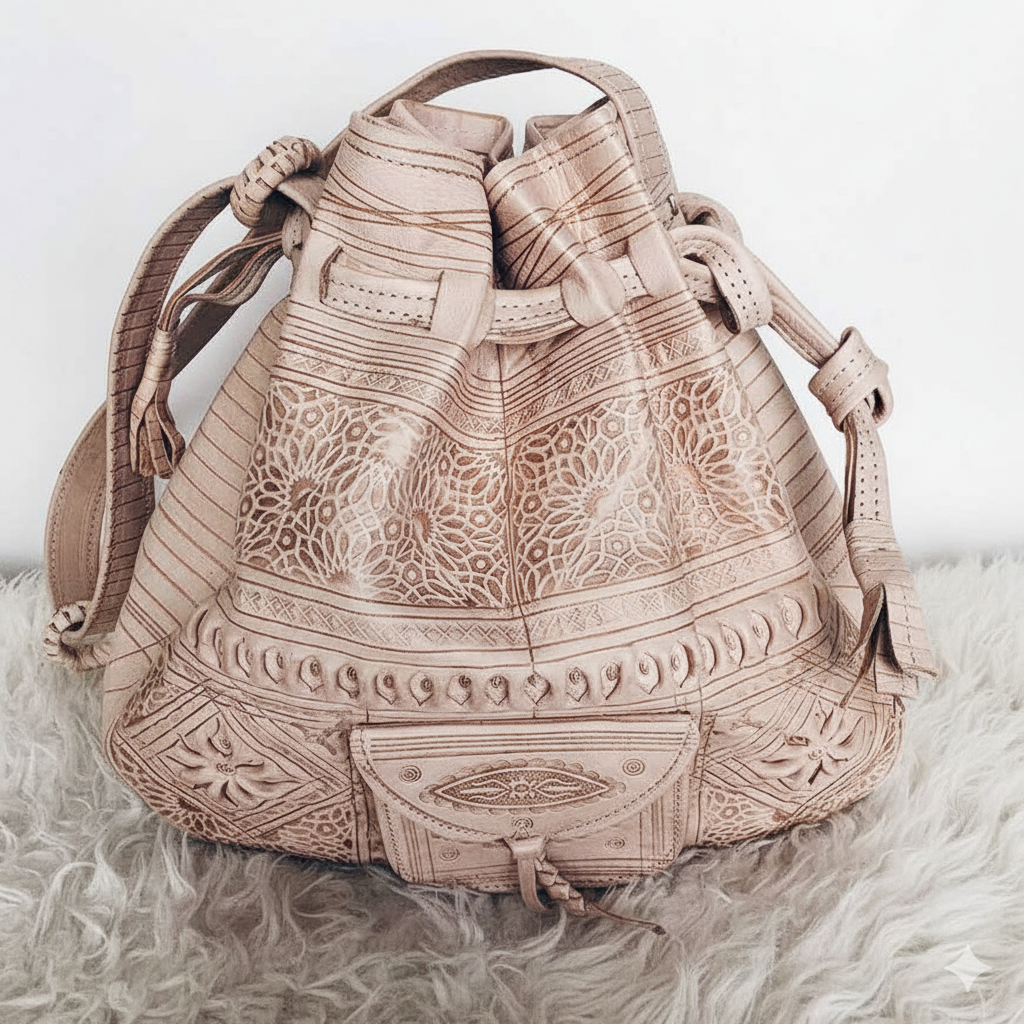 Each bag is meticulously hand-tooled by Omar, a master Moroccan leather artisan with over 20 years of experience. Deep-relief floral carvings, basket-weave stamped straps, saddle-stitched seams, and whipstitch detailing ensure heirloom-quality construction. The vegetable-tanned leather offers durability and natural aging that enhances its bohemian character over time.