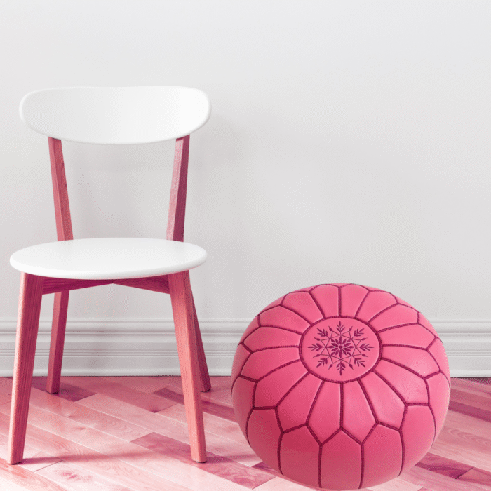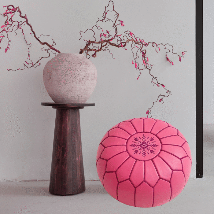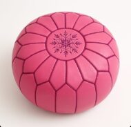 Ce coussin de siège marocain, de couleur rose foncé, est fabriqué à la main avec soin à partir de cuir de chèvre épais et résistant. Les détails subtilement ornés de motifs arabesques ajoutent une touche d’élégance à ce confortable coussin.