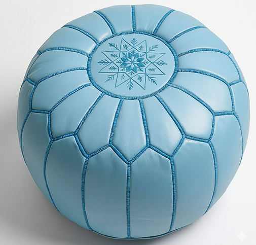 Bring color, comfort, and authentic craftsmanship into your home with this beautifully made round leather ottoman. Handcrafted in Marrakech using 100% genuine leather, this 21″ pouf blends timeless Moroccan artistry with modern versatility. Its smooth denim blue surface, accented by intricate off-white hand-embroidered star motifs, instantly elevates living rooms, bedrooms, reading corners, and creative spaces.