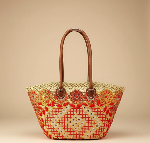 Embroidered Straw Tote Beach Bag – Handwoven Summer Basket with Leather Handles