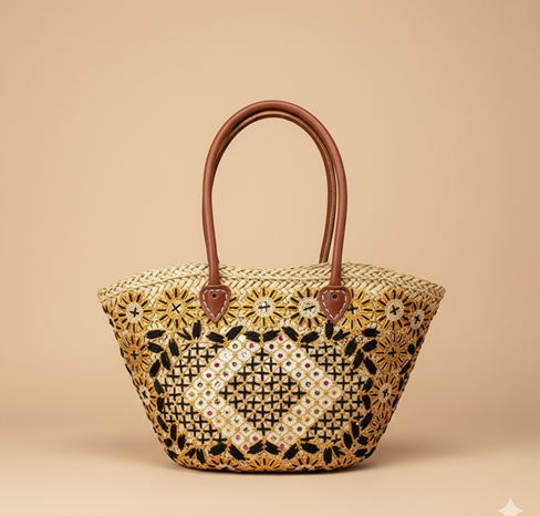 A beautifully handwoven straw tote bag featuring vibrant cotton embroidery and premium leather handles—perfect for summer outings, market runs, beach days, and everyday eco-friendly style. Lightweight, spacious, and crafted by Moroccan artisan Dounia.