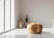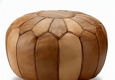 Each pouf is meticulously handcrafted in Marrakech, Morocco, by master artisan Omar, who brings over 20 years of leatherworking expertise. Constructed from 16–20 curved full-grain leather panels, each pouf features hand-stitched scalloped seams using dark brown contrast thread to create a flower-like starburst pattern. The natural leather develops a rich patina over time, making every pouf unique and full of character.
