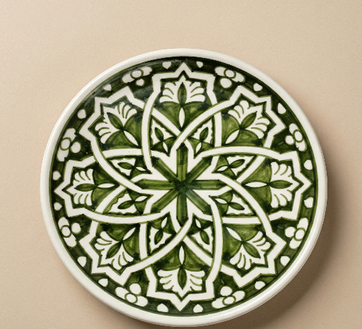 A handcrafted 25cm ceramic serving dish featuring a deep forest-green glaze and an elegant hand-drawn star mandala design. Made by Moroccan artisans using traditional pottery techniques, this piece blends functional durability with timeless geometric beauty.