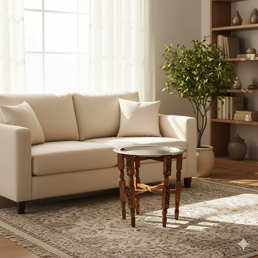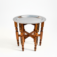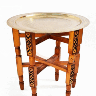 Choosing this tea tray table supports Marrakech’s endangered metalworking traditions and fair trade communities. Kamal’s workshop employs 14 master craftspeople and 6 apprentices earning 3-4x Morocco’s minimum wage, transferring skills to the next generation. The removable design honors traditional hospitality where siniya (brass serving trays) move from kitchen to gathering space. The dual-material construction—brass and carved wood—ages beautifully rather than degrades. Silver-plated brass develops warm patina over decades while solid wood gains character with use. The folding mechanism solves modern space challenges where multi-functional furniture is essential.