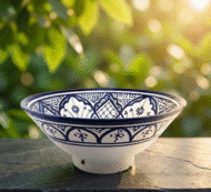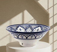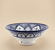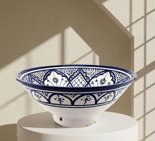 Every bowl begins on the potter’s wheel, shaped with mastery into perfect form. Once the clay has its footed base, skilled Moroccan artisans paint intricate navy blue Zwak patterns by hand—featuring lotus-inspired petals, scalloped borders, and geometric grids.