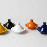 This set of four mini ceramic tagines adds color and charm to any table. Each piece is handcrafted from Safi clay and finished with a glossy, lead-free glaze in vibrant tones—mustard yellow, jet black, pure white, and burnt orange. At 10 cm, they’re perfectly sized for salt, spices, honey, jams, olives, or sauces.