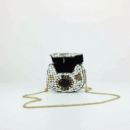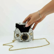 This handmade white mosaic purse is a stunning blend of artistry and elegance. Carefully crafted by skilled artisans, the exterior is covered with shimmering white mosaic pieces that create a refined and luxurious texture. At the center, a polished black stone adds a bold contrast, giving the purse a striking and sophisticated focal point.