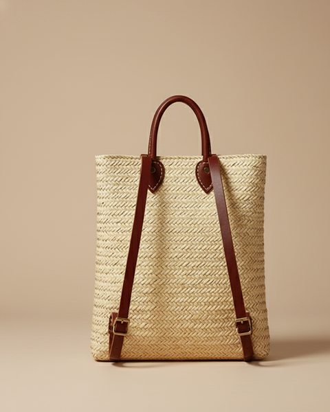 Handwoven Convertible Straw Backpack – Natural Fiber Tote with Premium Leather Straps