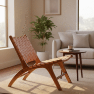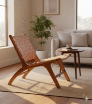 A beautifully handcrafted lounge chair featuring a solid teak wood frame and a handwoven leather seat. Its mid-century modern design brings warmth, comfort, and timeless elegance to any living space.