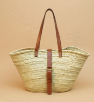 Each bag is meticulously handwoven by artisan Dounia using traditional Moroccan herringbone weaving techniques passed down for generations. The tight diagonal weave ensures strength and durability, while the leather straps, secured with contrast stitching and reinforced points, provide reliable support. Over time, the natural straw develops a warm, unique patina, making each bag truly one-of-a-kind.