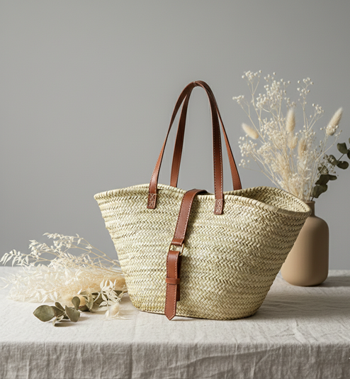 Handwoven Moroccan Straw Shoulder Bag – Natural Beach Tote with Leather Straps