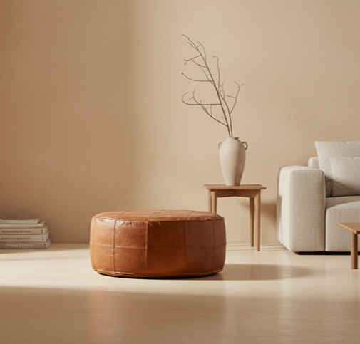 Bring authentic Moroccan artistry into your home with this luxurious full-grain leather round ottoman, handcrafted in the historic medina of Marrakech. Each pouf is made from 100% genuine full-grain leather, selected for its natural texture, warm caramel tones, and the beautiful patina it develops over time. Artisans carefully match leather panels and hand-stitch each seam using reinforced topstitching, creating a clean, geometric design that blends seamlessly with modern, bohemian, or minimalist interiors.