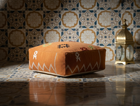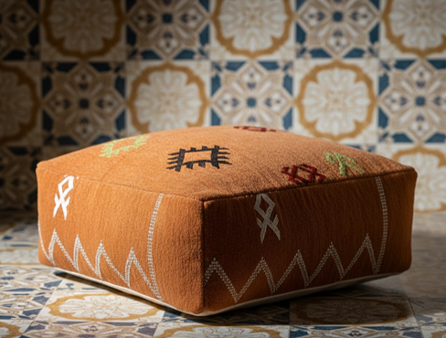 Add a vibrant, artisanal touch to your home with this Moroccan Vintage Kilim Pouf, handcrafted from upcycled Berber rugs. Each pouf features unique patterns and bright orange tones, giving it a one-of-a-kind character perfect for living rooms, bedrooms, or den spaces.