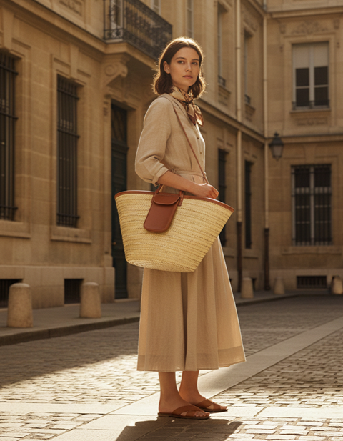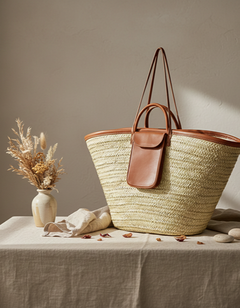 Eco-Friendly Materials: Biodegradable palm straw and vegetable-tanned leather