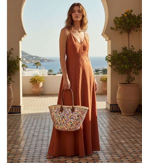 Découvrez un accessoire qui transforme chaque sortie en une parenthèse colorée. Ce Rainbow Sequin Straw Tote est bien plus qu’un simple panier : c’est une pièce artisanale unique, tissée à la main au Maroc et sublimée par des milliers de sequins multicolores appliqués un à un.