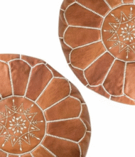Elevate your home with this set of two handcrafted Moroccan leather ottomans. Made from 100% genuine tan leather and stitched by master artisans in Marrakech, each round pouf measures 21″ x 12″ and features traditional white star embroidery. Perfect as extra seating, a footrest, meditation cushion, or boho décor accent. Available filled or unfilled for flexible worldwide shipping.
