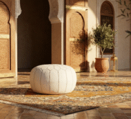 A beautifully handcrafted white Moroccan leather pouf designed for modern interiors. This 21″ round ottoman offers versatile floor seating, stunning artisan detailing, and a clean minimalist aesthetic that brightens any space.