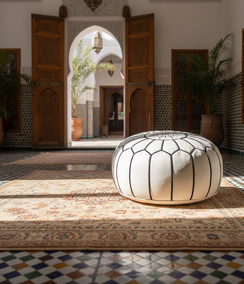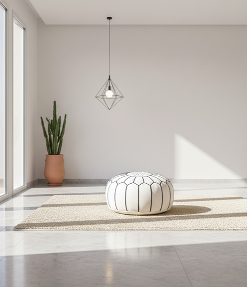 Elevate your home with this 21-inch White Moroccan Leather Floor Ottoman, a handcrafted statement piece designed in the heart of Marrakech’s historic medina. Made from 100% genuine leather, this round pouf blends traditional Moroccan artistry with modern minimalist style, making it a versatile addition to living rooms, bedrooms, meditation spaces, nurseries, and boutique interiors.